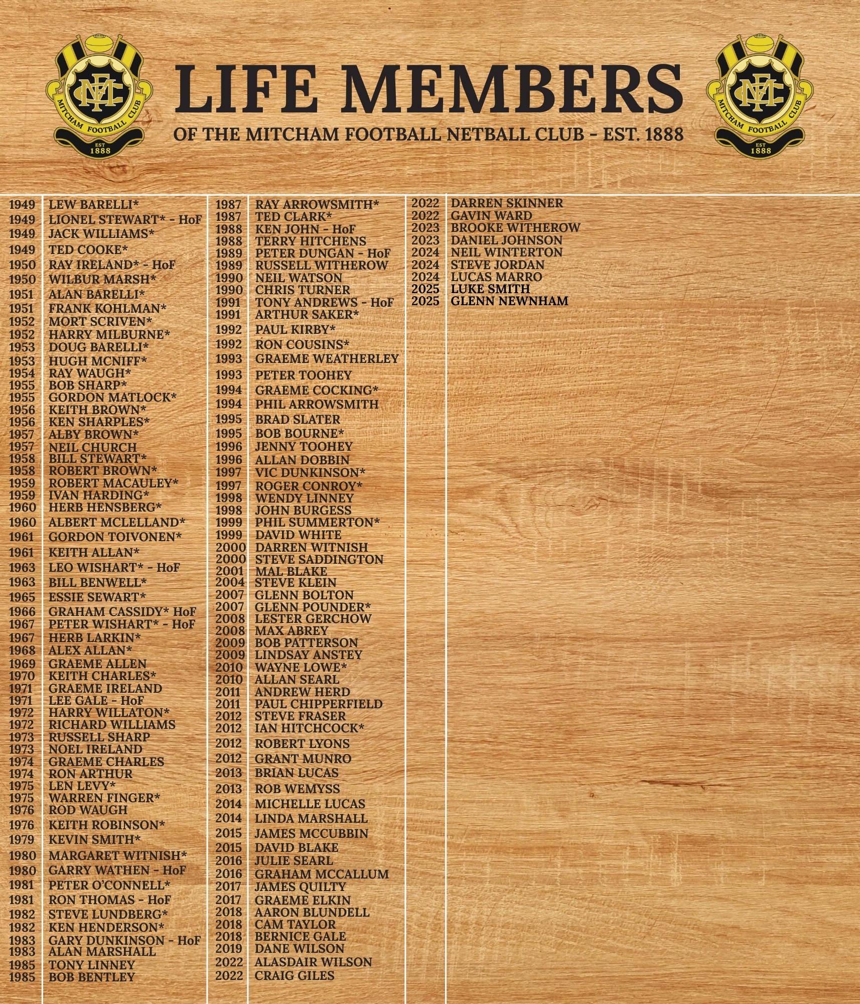 The Mitcham Football Club first awarded Honorary Life Membership in 1949. This honour was introduced to recognise the outstanding contributions of players, officials, support staff, trainers, and administrators who have provided exceptional service to the club. It is regarded as the second-highest accolade the club can bestow upon an individual, sitting just behind induction into the Hall of Fame.